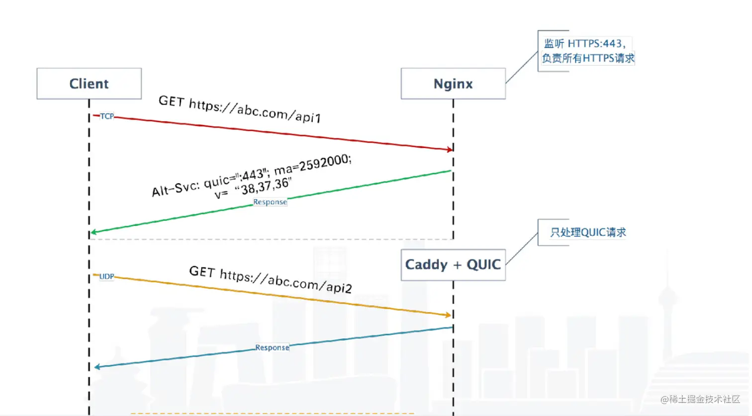 | 使用基于 quic-go 的 caddy 处理 QUIC 请求caddyserver.com/docs | 能够支持 QUIC | 需要安装 caddy,需要运维支持 低 | 高 |