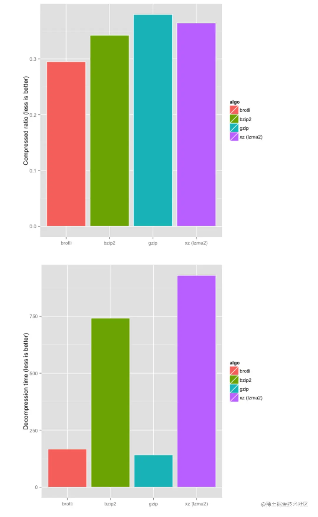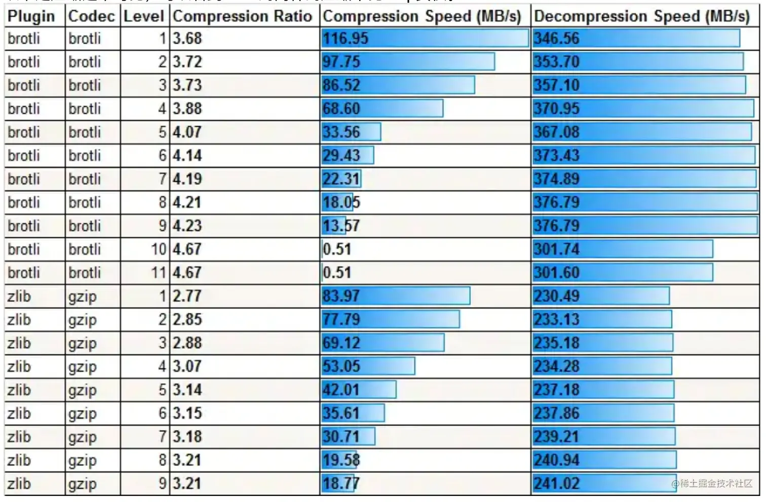以下是压缩速率对比,可以看到 Brotli 的同样的压缩率比 Gzip 要快。