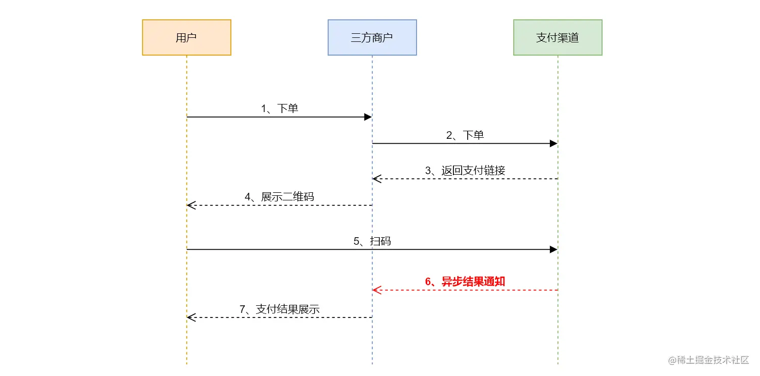 上图是目前扫码支付中普遍的数据流转情况。在此场景中,异步结果通知 承担着保证两系统(支付渠道和商户)之间 数据一致性 的工作。当有支付结果时,为保证时效性,必须 立即 通知给下游商户,且当通知失败时需要尽量保证系统间数据一致性,即遵循约定的 重试策略。由此可以看出是十分重要的一个环节。