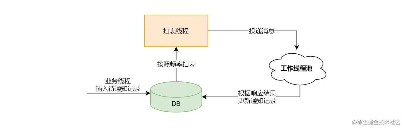 - 新建扫表任务和异步通知工作线程池,扫表任务负责把满足通知条件的记录从表里捞出来,并把该消息推入工作线程池。工作线程通过网络交互负责将消息推给下游商户,根据商户响应内容,更新 异步通知表 记录的相关信息