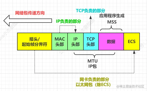 - 发送缓冲区中的数据如果超过MSS的长度,就会被以MSS长度进行拆分放进单独的网络包中