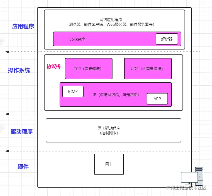 知道了IP地址后,就可以委托操作系统内部的协议栈向这个目标IP地址发送消息了
