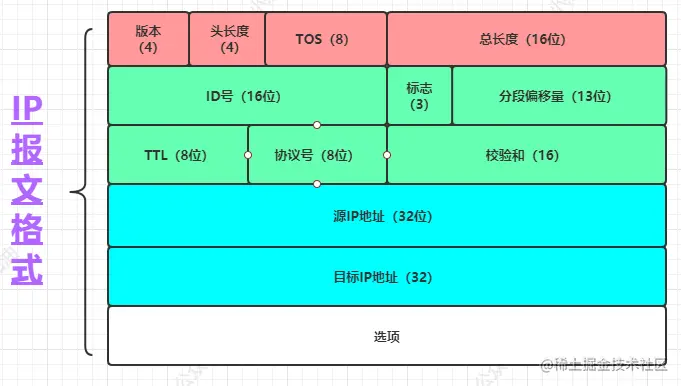 - 接收方IP地址(32比特): 网络包接收方的IP地址