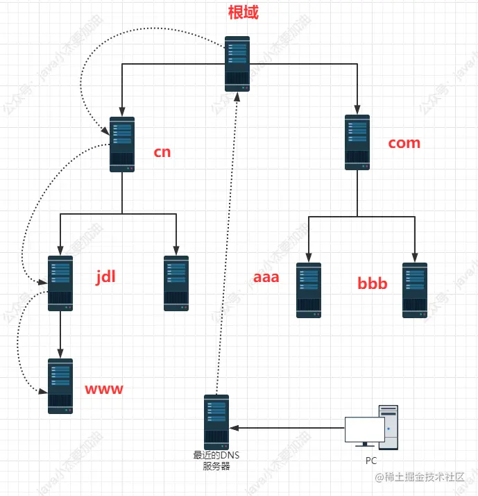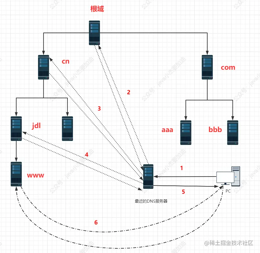 但是一台服务器存不下这么多,所以一般都是DNS服务器大接力来寻找这个ip地址,图如下