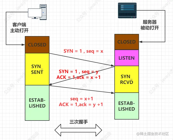 - 客户端收到后发送ACK =1, seq = x+1,ack = y+1给服务器,此时客户端状态是ESTAB-LISHED
