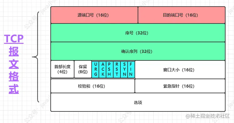 - 窗口大小(16位): 接收方告知发送方窗口大小(即无需等待确认可一起发送的数据)