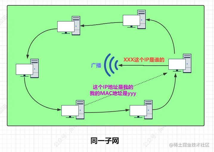 - 在同一个子网中,利用广播对所有设备提问 XXX这个ip地址是谁的,其他设备发现自己的ip地址是这个xxx的话,那么他就会把它的MAC地址告诉提问者,这样就会检测到接收方的MAC地址了,如果发现自己的ip地址不是这个XXX,那么则会丢弃这个消息并不去理会。