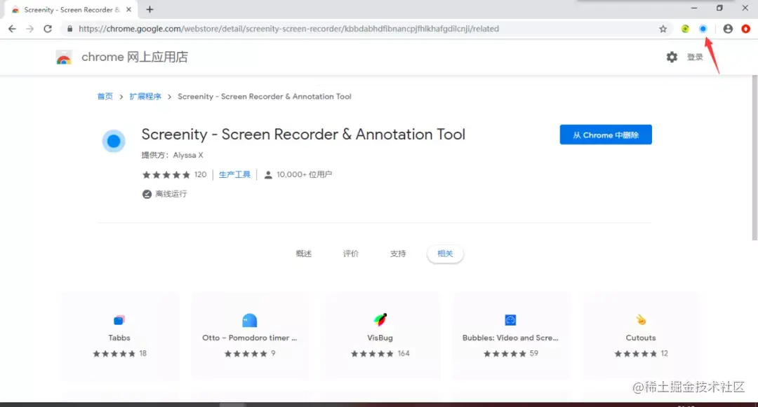 安装成功后,在浏览器扩展栏里多出来一个蓝色小圆圈,点击就能进行录屏了:
