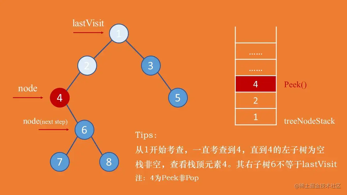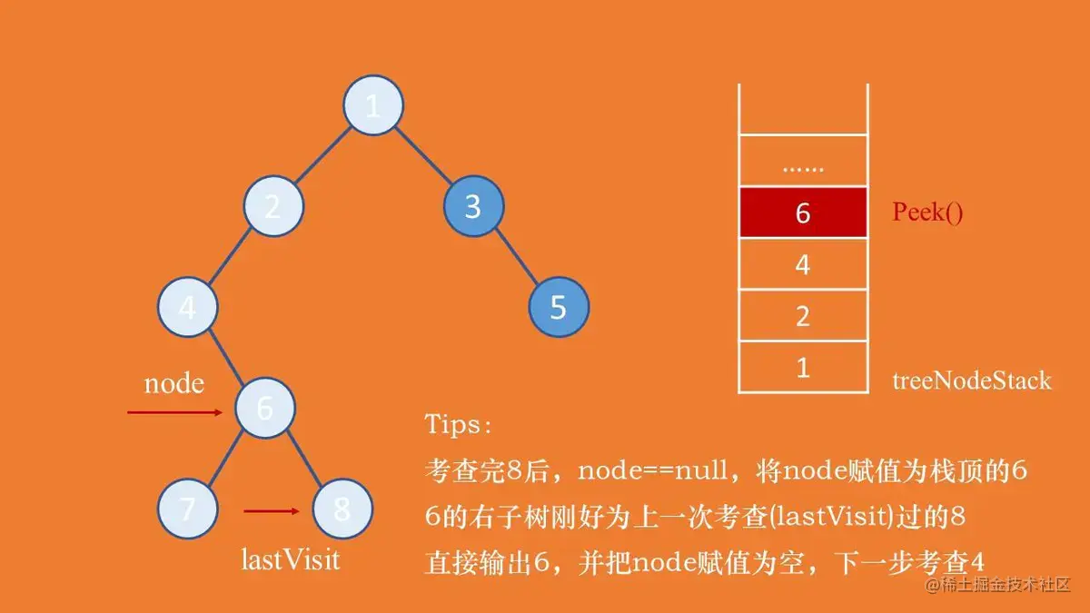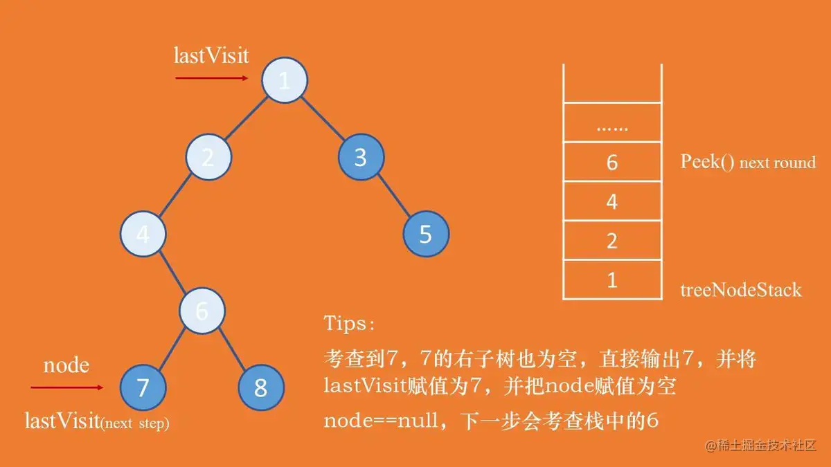 此时需要把lastVisit设置成节点7,并把游标节点node设置成null,下一轮循环的时候会考查栈中的父节点6。