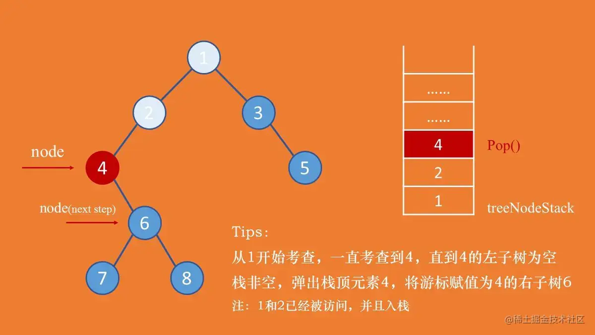 发现节点4的右子树非空,需要接着考查右子树,4不能输出,node = node.right。