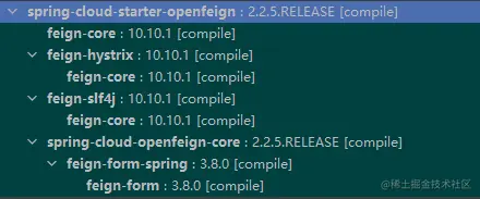 spring-cloud-starter-openfeign 会帮我们引入如下依赖,包含了 OpenFeign 的核心组件。