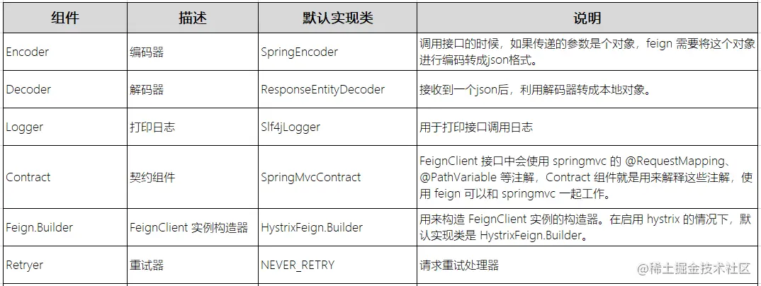 这些其实就是 Feign 的核心组件了,对应的默认实现类如下。