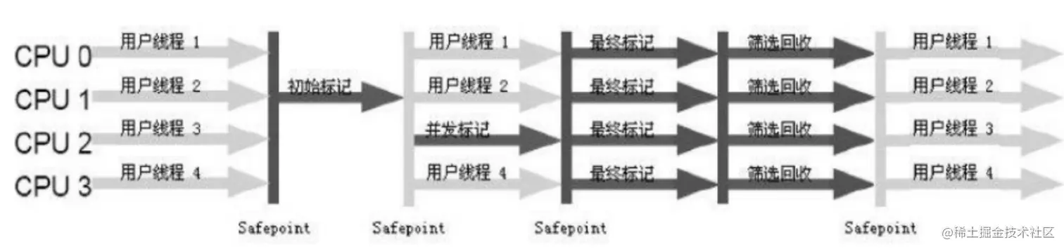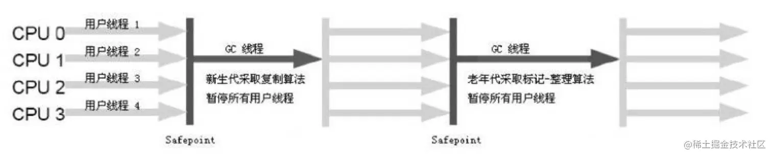 这里要先讲一个叫安全点(Safepoint)的东西,程序并非在所有的地方都能停下来进行GC,而是在“特定的位置”(安全点)到达时才能暂停。安全点的选定不能太少让GC等待时间太长,也不能太多频繁GC。