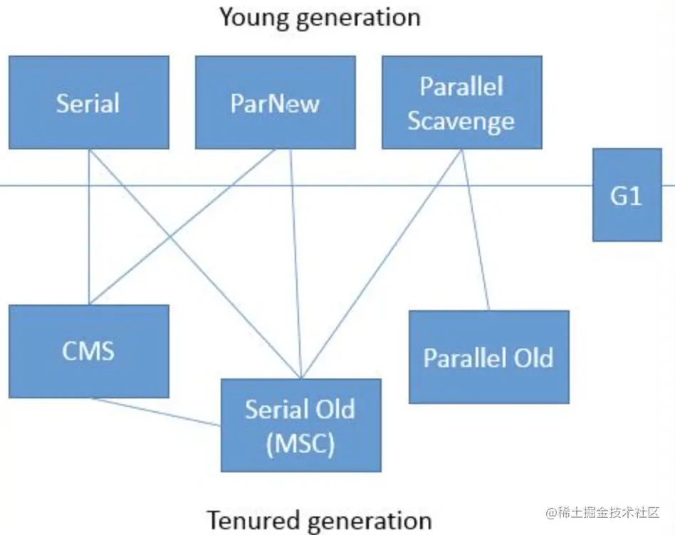 每个年代都有各自适用的收集器,如新生代使用Serial、ParNew、Parallel和G1(G1是两个年代适用的),老年代适用CMS、Serial Old和Parallel Old。图中的连线代表可以配合适用,没有连线的代表不能配合适用。