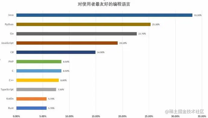 在用户友好度上,Java 一骑绝尘,以 33.2% 的得票率遥遥领先,被评为对使用者最友好的编程语言。Python 则以 25.3% 的得票率,排名第二,同样被评为一门对使用者非常友好的编程语言。Go 语言排名第三,得票率为 22.70%。