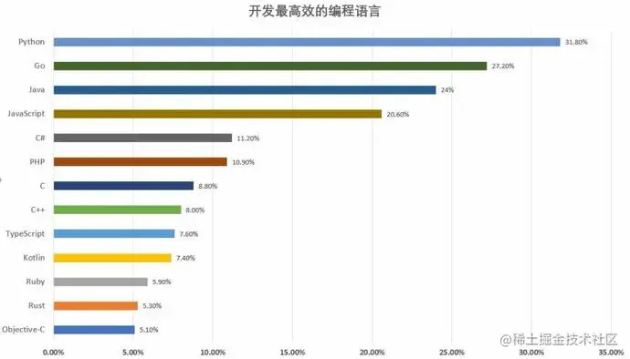 在开发高效方面,Python 获得超过 30% 用户的支持,排名第一,被评为开发效率最高的编程语言。这主要归功于 Python 语法简单。Go 和 Java 分别以 27.2%、24% 的得票率排名第二、第三,也被评为开发效率很高的编程语言。JavaScript 得票率为 20.6%,排名第四,它的开发效率也很高。这主要得益于两点:一、JavaScript 是一门脚本语言,不涉及硬件操作和内存分配;二、JavaScript 的语法结构简单,容易入门。