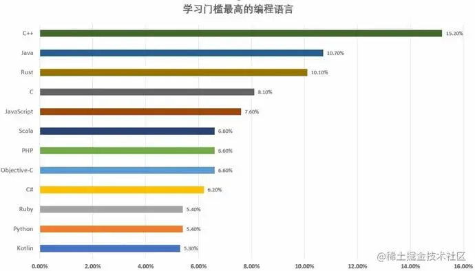 在学习门槛方面,C++ 以 15.2% 的得票率排名第一,被评为学习门槛最高的编程语言。为什么 C++ 难学?奇虎 360 技术专家罗剑锋在极客时间《罗剑锋的 C++ 实战笔记》专栏中这样解释,“随着标准版本的演进,C++ 里包含的东西也越来越多。最早的 C++98 只有 60 来个关键字,到 C++11 变成了 70 多个,C++20 则膨胀到了近百个。对比一下同级别的 Java、Go 等语言,C++ 真称得上是‘巨无霸’。而且这还仅仅是核心语言,外面还有更庞大的标准库在等着你。不断膨胀的核心语言加上庞大的标准库,让学习、使用 C++ 的门槛无形中提高了很多。”