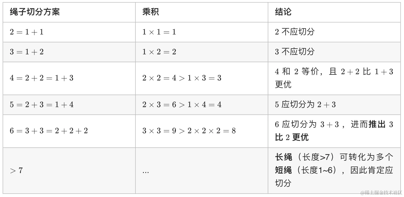 if n <= 3: return n -1 - 为使乘积最大,只有长度为2和3的绳子不应再切分,且3比2更优,具体如下表: