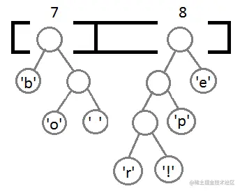 接下来就是我们的算法——把这个Priority Queue 转成二叉树。我们始终从queue的头取两个元素来构造一个二叉树(第一个元素是左结点,第二个是右结点),并把这两个元素的priority相加,并放回Priority中(再次注意,这里的Priority就是字符出现的次数),然后,我们得到下面的数据图表: