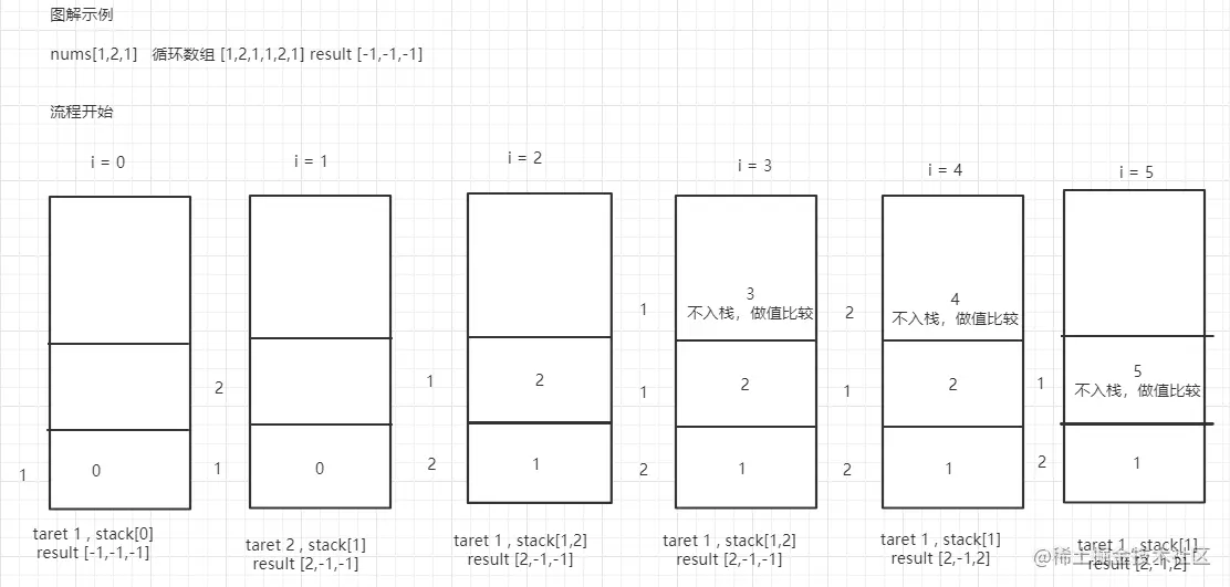 /** * @param {number[]} nums * @return {number[]} */ var nextGreaterElements = function(nums) { let len = nums.length // 结果值 默认都为 -1 ,待找到下一个更大值时替换 let result = new Array(len).fill(-1) // 栈 let stack = [] for(let i=0;i<len*2;i++){ let target = nums[i%len] while(stack.length>0 && target>nums[stack[stack.length - 1]]){ result[stack[stack.length - 1]] = target stack.pop() } if(i<len) stack.push(i) } return result };