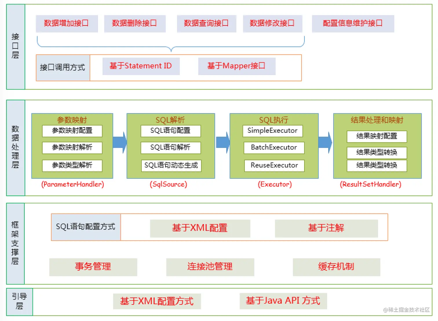 (3)基础支撑层:负责最基础的功能支撑,包括连接管理、事务管理、配置加载和缓存处理,这些都是共用的东西,将他们抽取出来作为最基础的组件。为上层的数据处理层提供最基础的支撑。