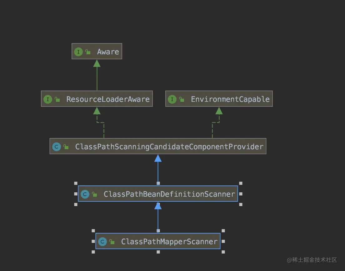 Spring可通过多种方式加载BeanDefinition,从XmlBeanDefinitionReader到ClassPathBeanDefinitionScanner在到ConfigurationClassBeanDefinitionReader分别对应xml、@component、@configuration类定义的加载。Mapper BeanDefinition可通过2种形式加载MapperScannerConfigurer和@MapperScan注解,内部都是通过ClassPathMapperScanner实现。ClassPathMapperScanner继承了ClassPathBeanDefinitionScanner,类图如下