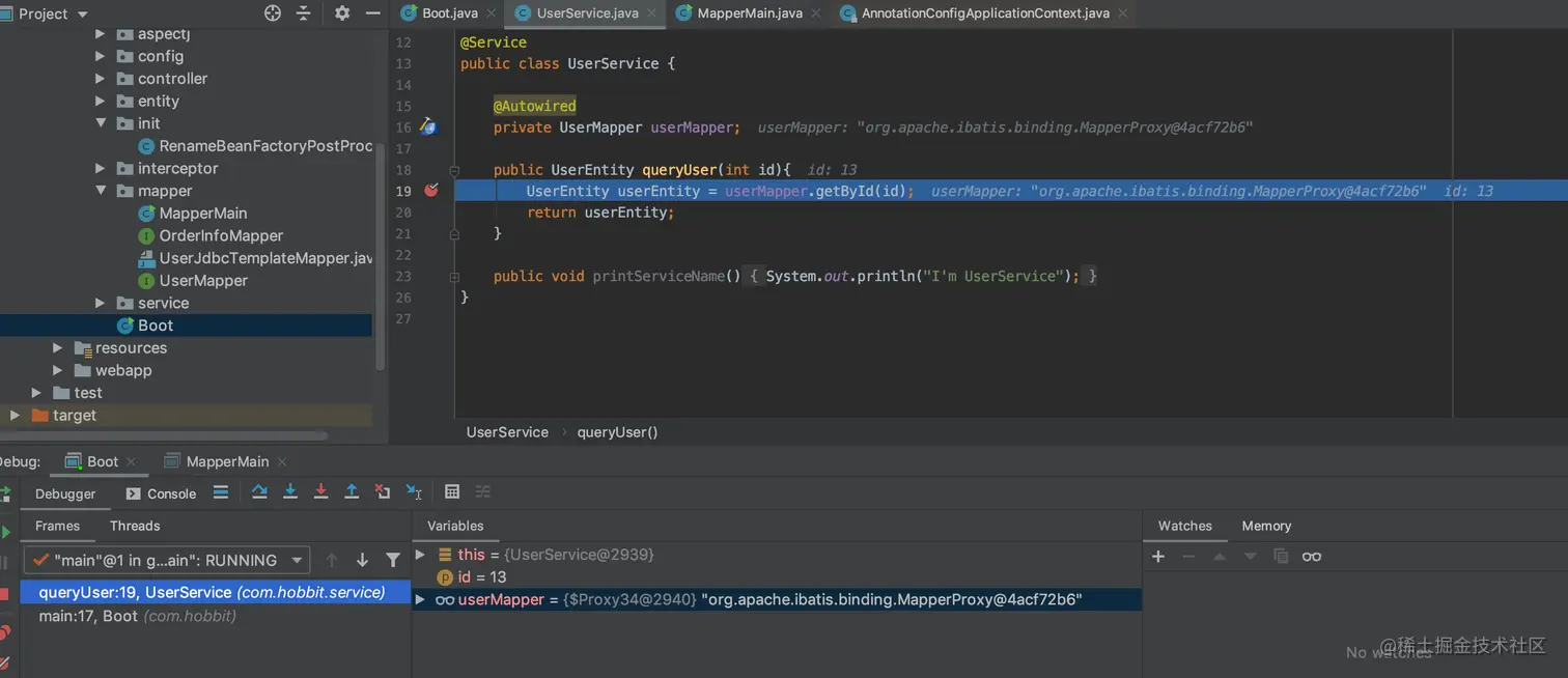通过运行时Debugger,确实与直接使用Mapper一样的代理对象。userMapper的类型为:org.apache.ibatis.binding.MapperProxy@4acf72b6。