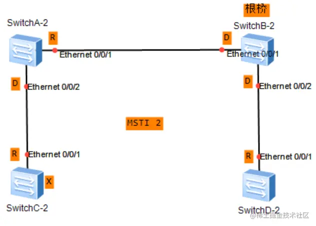 - 在MSTI2中,SwitchA的Ethernet0/0/1成为指定端口,Ethernet0/0/2成为根端口;