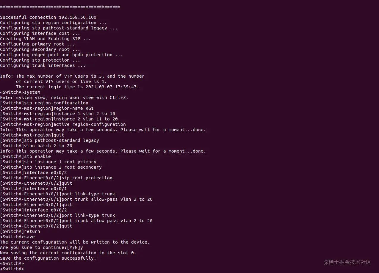 $ ssh-keygen -f "/home/sht/.ssh/known_hosts" -R "192.168.50.100" # $ ssh-keygen -f "/home/sht/.ssh/known_hosts" -R "192.168.50.101" # $ ssh-keygen -f "/home/sht/.ssh/known_hosts" -R "192.168.50.102" # $ ssh-keygen -f "/home/sht/.ssh/known_hosts" -R "192.168.50.103"如果都能成功登录,则说明Ubuntu与交换机连通性良好,并且可以进行远程登录;