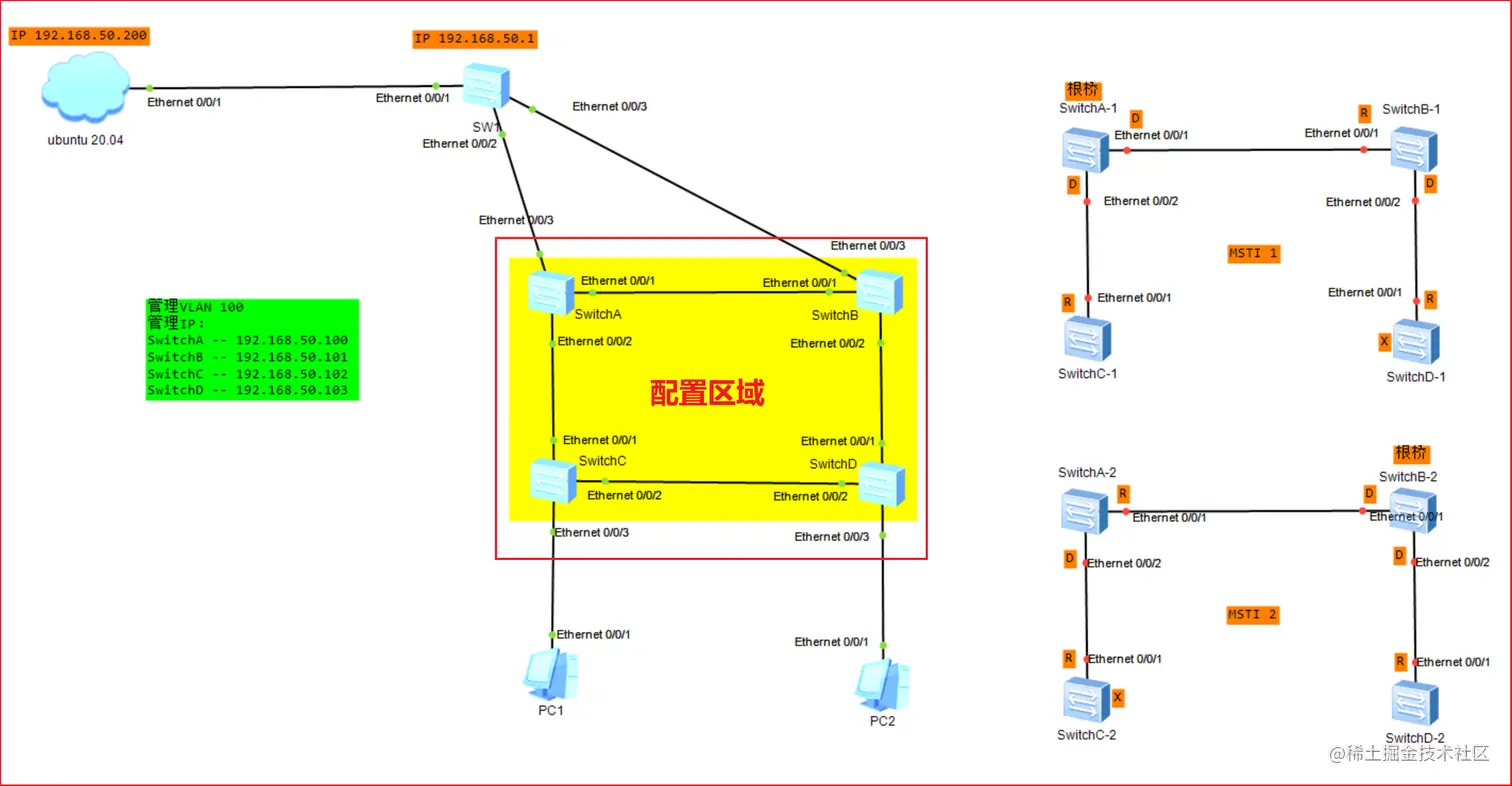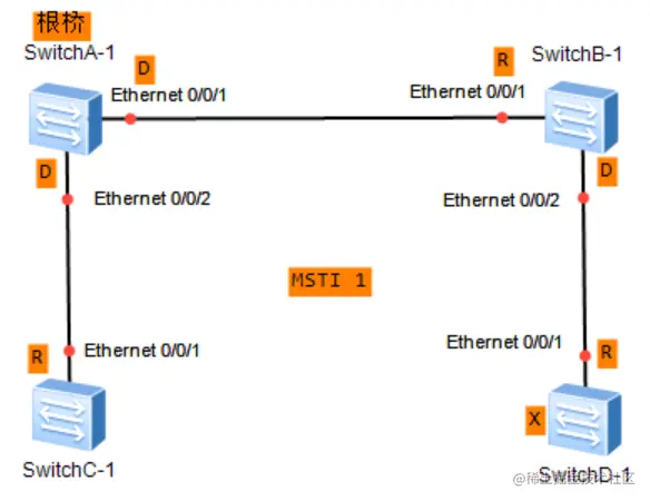 - 在MST1中,SwitchA作为根,阻塞SwitchD的Ethernet0/0/2接口