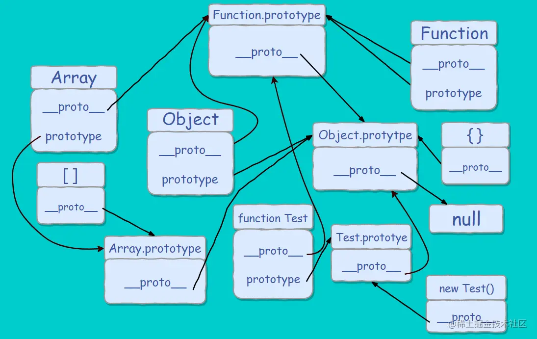 每个对象都有一个内部属性 [[Prototype]],也被称为隐式原型。 该属性指向构造函数的原型。js 中没有访问 [[Prototype]] 的标准方式,但 Firefox、Safari 和 Chrome 会在每个对象上暴露 __proto__ 属性。