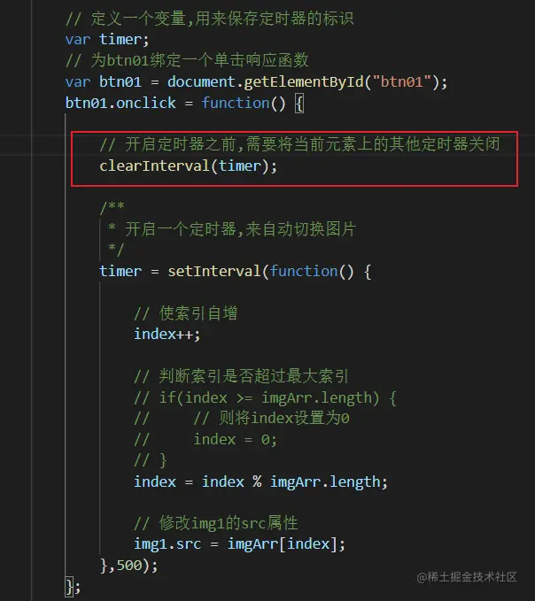 目前,我们每点击一次按钮,就会开启一个定时器,点击多次就会开启多个定时器,这就导致图片的切换速度过快,并且我们只能关闭最后一次开启的定时器