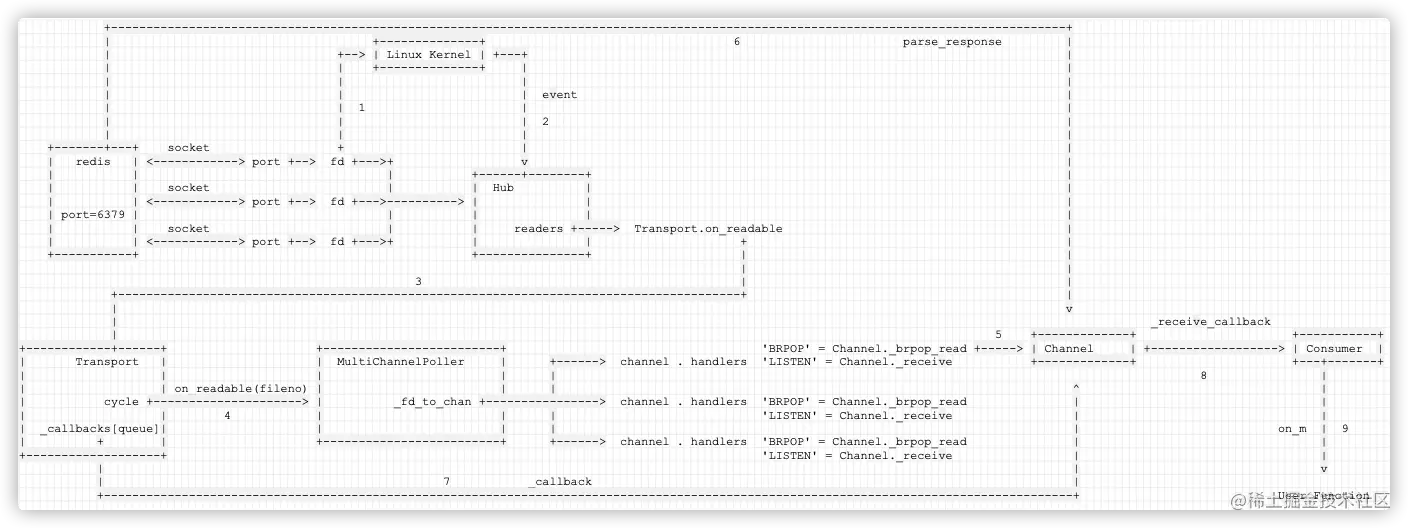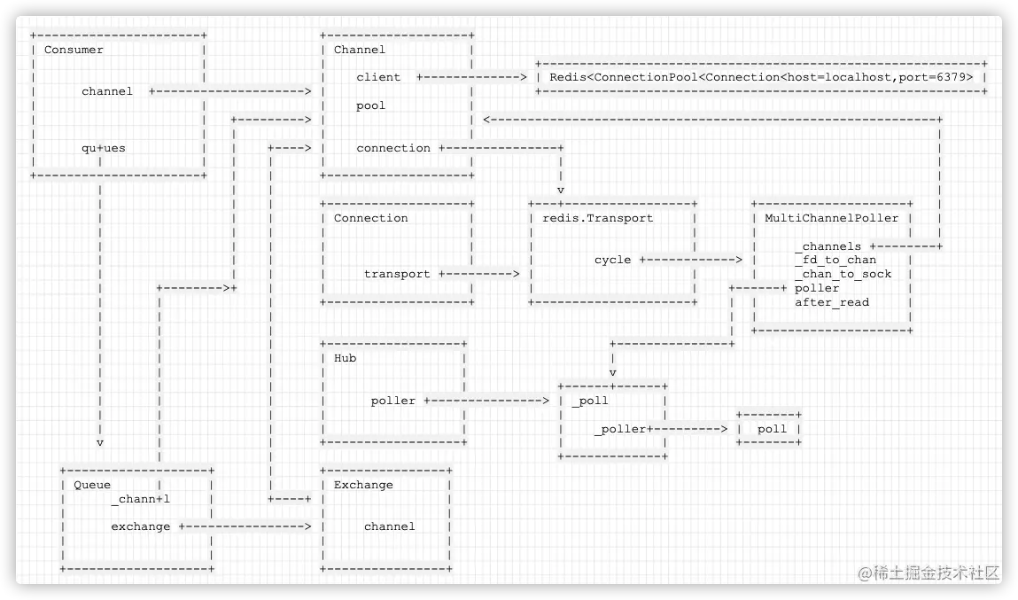Kombu并不直接让Channel使用Connection来发送/接受请求,而是引入了一个新的抽象Transport,Transport负责具体的MQ的操作,也就是说Channel的操作都会落到Transport上执行。是以Transport为中心,把Channel代表的真实redis与Hub其中的poll联系起来。