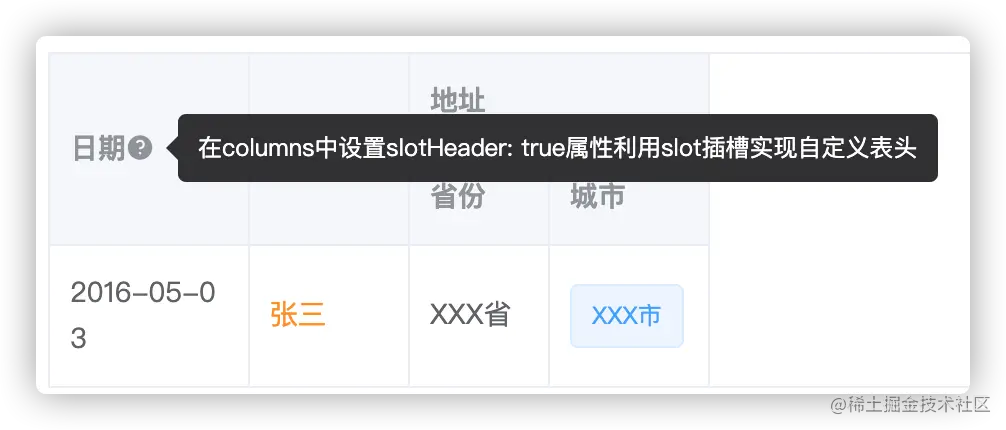 slot='header'自定义表头内容,需要设置一个slotHeader=true属性