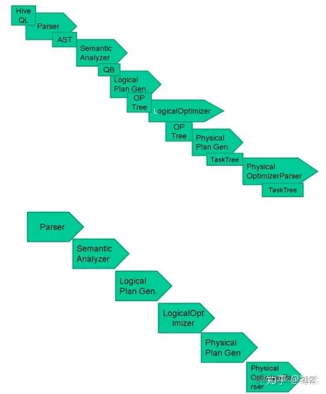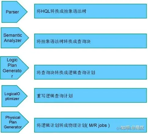 HiveSQL ->AST(抽象语法树) -> QB(查询块) ->OperatorTree(操作树)->优化后的操作树->mapreduce任务树->优化后的mapreduce任务树