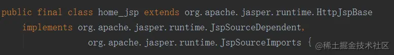 继承的HttpJspBase是HttpServlet的子类,可见它是一个符合Servlet规范的Java类,html语句以out.write的形式被写入到请求体中。