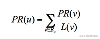 u 为待评估的页面,Bu 为页面 u 的入链集合。针对入链集合中的任意页面 v,它能给 u 带来的影响力是其自身的影响力 PR(v) 除以 v 页面的出链数量,即页面 v 把影响力 PR(v) 平均分配给了它的出链,这样统计所有能给 u 带来链接的页面 v,得到的总和就是网页 u 的影响力,即为 PR(u)。