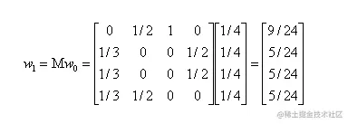 然后我们再用转移矩阵乘以 w1 得到 w2 结果,直到第 n 次迭代后 wn 影响力不再发生变化,可以收敛到 (0.3333,0.2222,0.2222,0.2222),也就是对应着 A、B、C、D 四个页面最终平衡状态下的影响力。