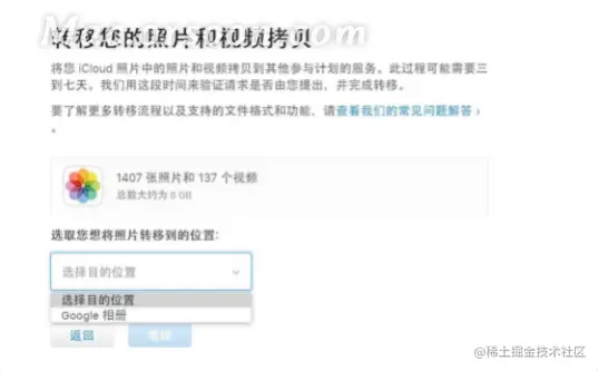四、在接下来的页面,你可以看到你的iCloud的帐号中的照片和视频的数量,可以进行核实帐号是否正确。在下拉菜单中,选择“Goolge 相册”