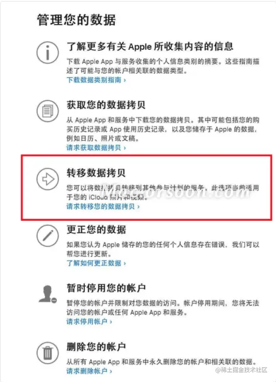 三、如果你的Apple ID符合条件,点击页面中第三项转移数据拷贝下方链接,如图:(如果不符合条件,则不会有此项)