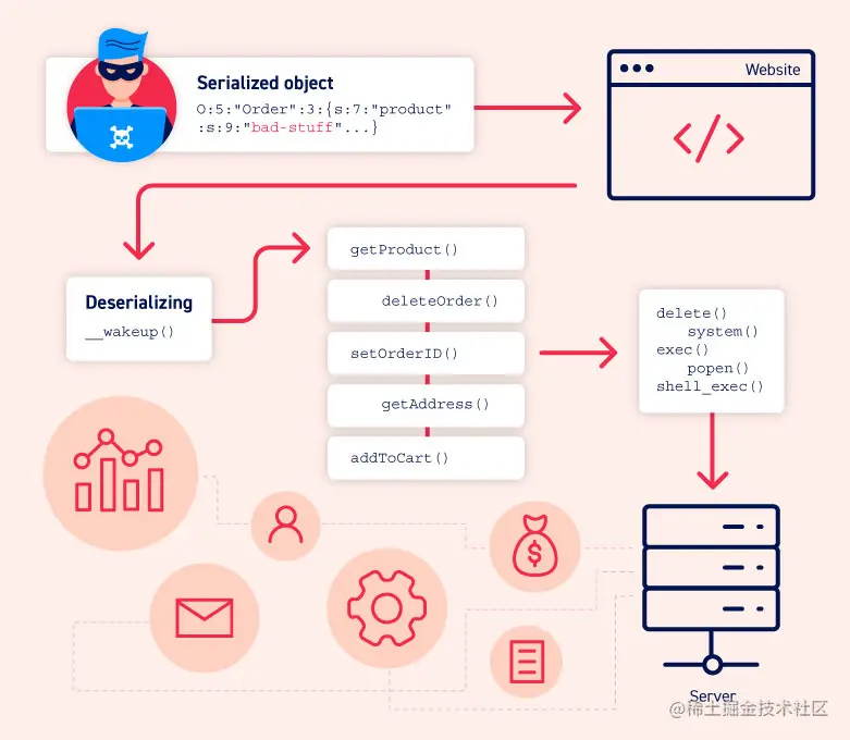在这种情况下,最重要的是,某些语言具有在反序列化过程中自动调用的魔术方法。例如,PHP 的 unserialize() 方法查找并调用对象的 __wakeup() 神奇的方法。