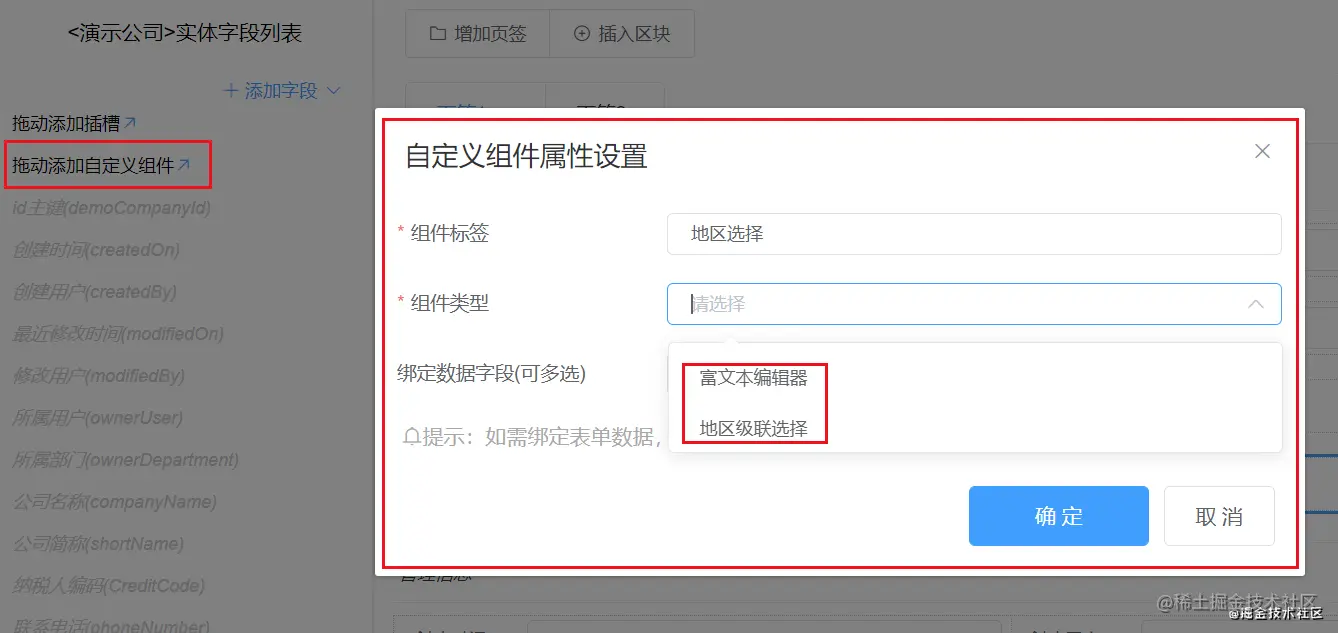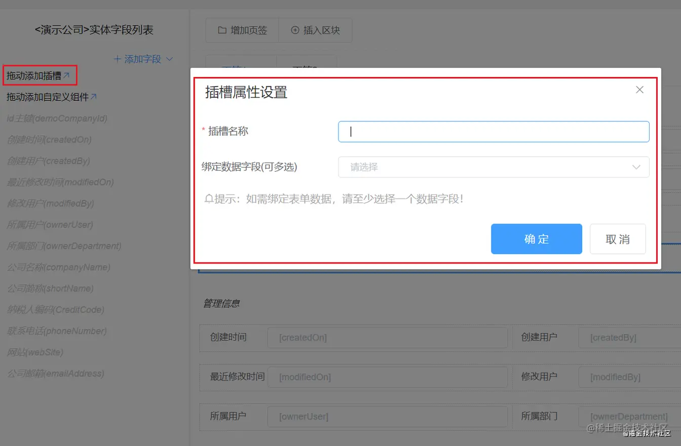 为了满足表单设计的多样性和动态展示需求,表单需要能嵌入插槽。表单插槽为在运行时动态调整表单提供了可能性,表单插槽名称必须在当前表单中唯一,如果在插槽内需要获取数据,则需要绑定数据字段(可绑定多个),如下图所示: