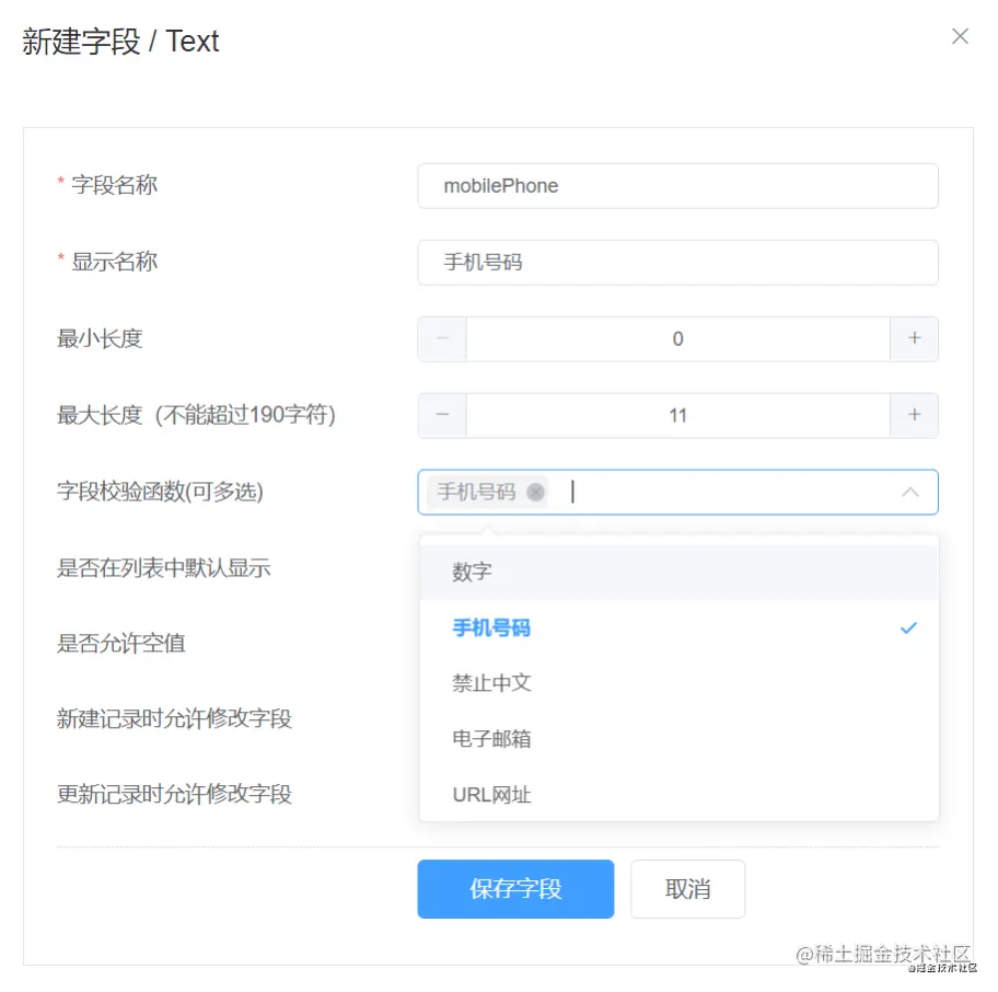 此外,大部分字段(图片、文件字段除外)支持添加自定义校验规则,自定义校验规则的函数来源于src/utils/validators.js,可以参照现有函数添加更多自定义校验规则函数。所有的自定义校验函数可以作用于字段组件,并且多个校验函数可以叠加,如下图所示: