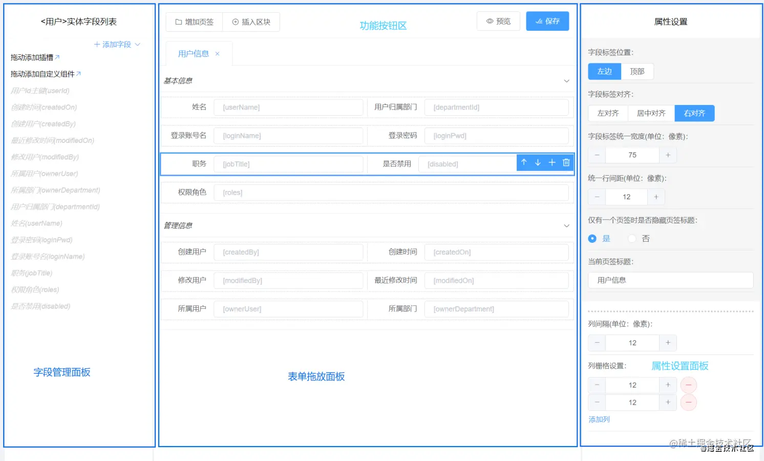 跟其他表单设计方案的最大区别在于,字段作为表单布局的基本逻辑组件,字段具备自动数据加载和存储能力,不需要设计数据库、不需要对接后端API,这一切都是自动完成的,毕竟我们是要做一个1天搭建100个表单和列表的全栈开发平台。
