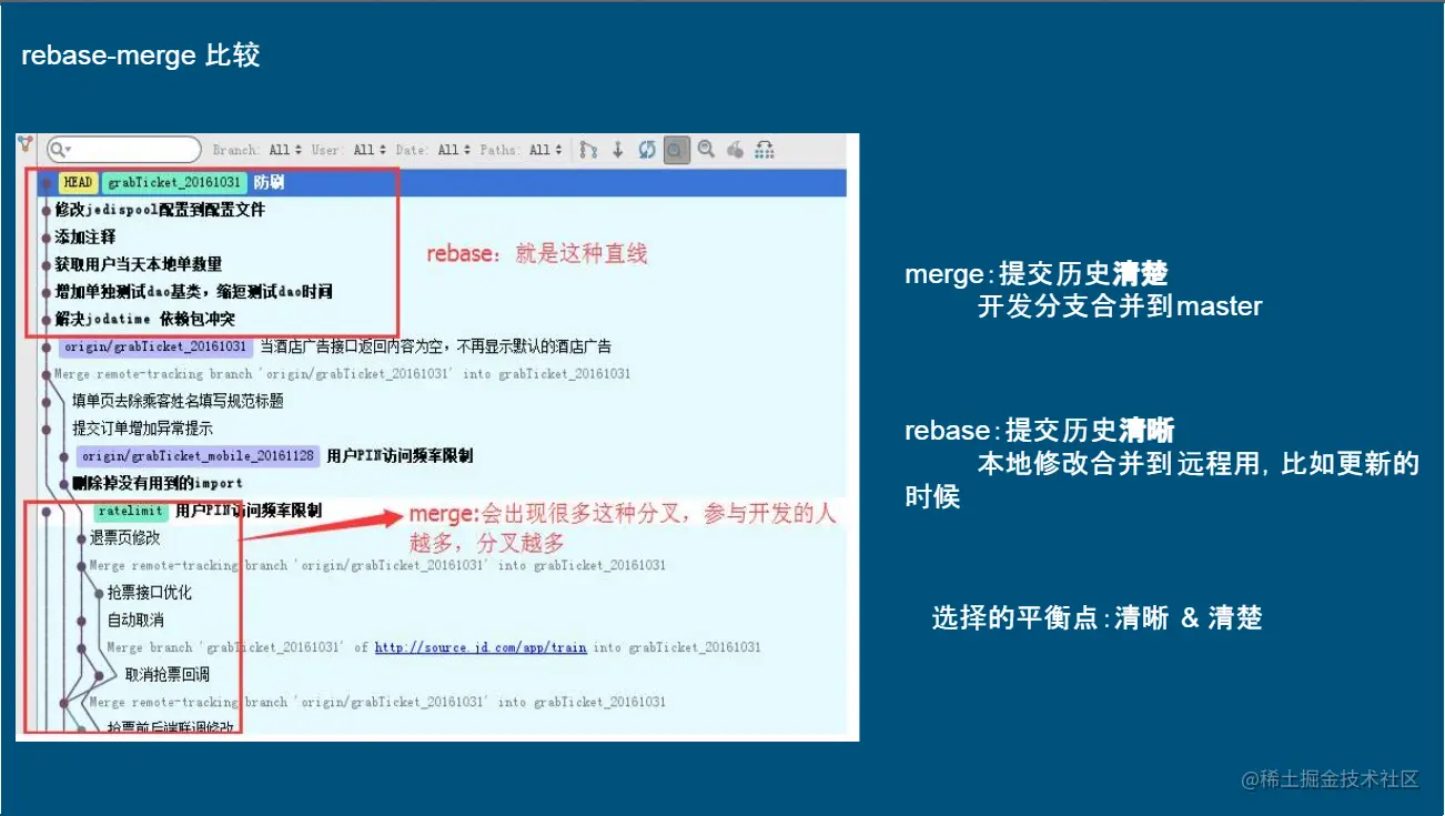 首先对比merge和rebase合并代码的区别,merge合并的代码会出现分叉,开发的人越多,分叉越多,容易使master分支看起来不直观,不便于维护,而使用rebase进行合并代码master则会呈现出一条直线,非常直观。