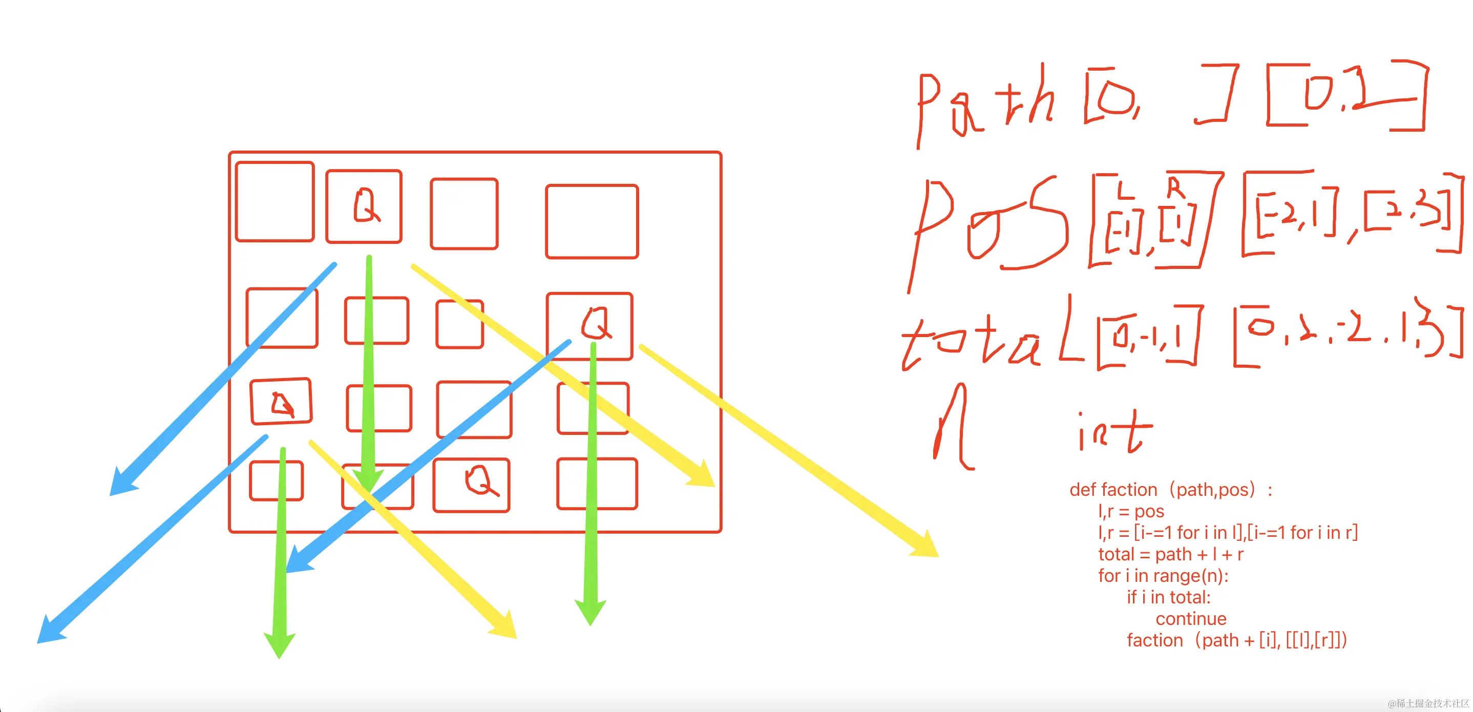 那我们就可以针对这个不能放置Q的点定义一个变量pos = [[],[],[]],里面由三个数产生,分别是向下的向左的和向右的我们定义为l,r,m ,由于这个m是和path重复的这个变量我们就重新定义为
