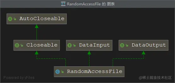 我们从图中可以看到 RandomAccessFile 并非继承于 InputStream 和 OutputStream 两个接口,而是继承于有些陌生的DateInput 和 DataOutput。