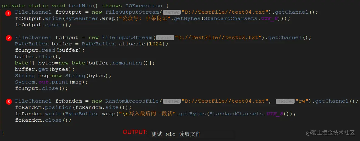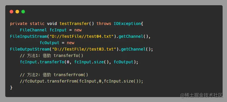 程序员往往都是比较懒惰的,上面那种读取后再通知 FileChannel 的方式似乎有些麻烦。那么有没有更加简单的方法?肯定是有的,不然我也不会问是吧~ 那就是让一个通道与另外一个通道直接相连接,这就得借助特殊的方法transferTo() 和 transferFrom() 。具体使用如下:
