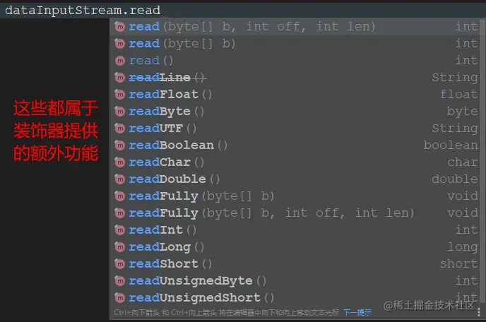 其中DataInputStream允许我们读取不同的基本数据类型数据以及String对象,搭配相应的DataOutputStream,我们就可以通过数据"流" 将基本类型的数据从一个地方迁移到另一个地方。
