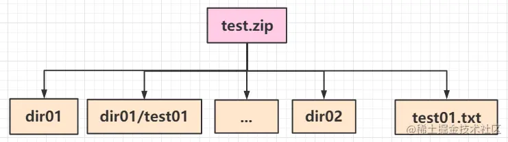 每次都会遍历完一个目录下的所有文件,例如 dir01 文件夹下的所有文件,才会继续遍历 dir02 文件夹,所以我们不必使用递归的方式去获取所有文件。取到每一个文件后,通过 ZipFile获取输出流,然后写入到解压后的文件中。大致流程如下: